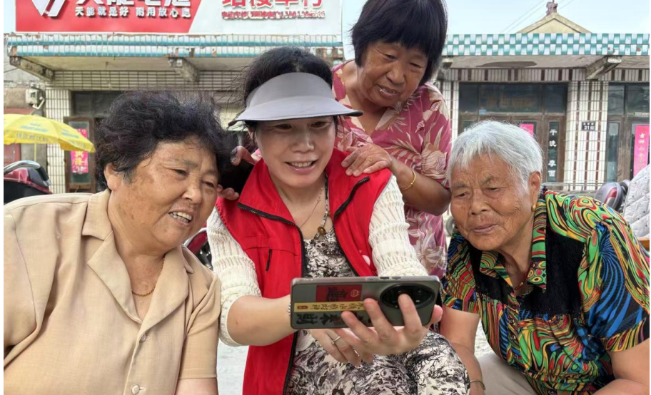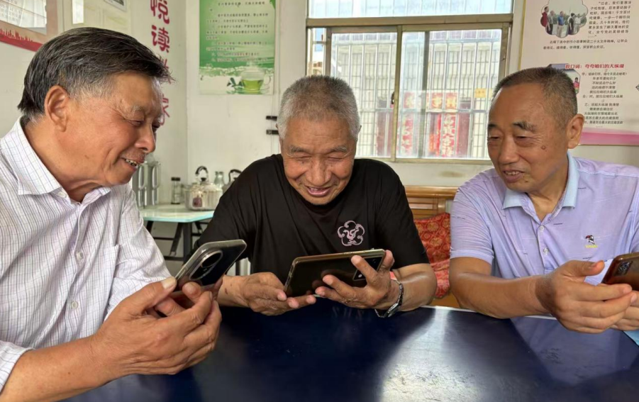 在集镇大街小巷,群众都围坐在一起手捧手机收看阅兵直播。