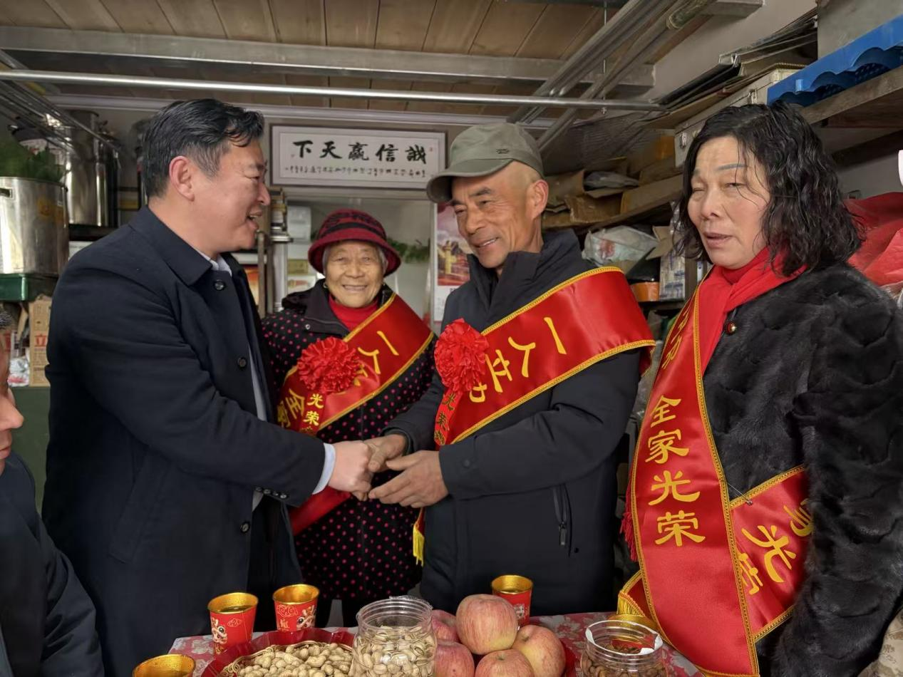 2 月 6 日上午,由盐都区退役军人事务管理局、盐城大纵湖旅游度假区及相关村(社区)组成的送喜报小组,先后前往镜湖村、平湖居委会,为立功受奖的现役军人王华、宋志远、宋健家属送上立功喜报,佩戴光荣绶带,让军人军属共享荣光时刻,营造 “一人立功、全家光荣、全社会尊崇”的浓厚氛围。