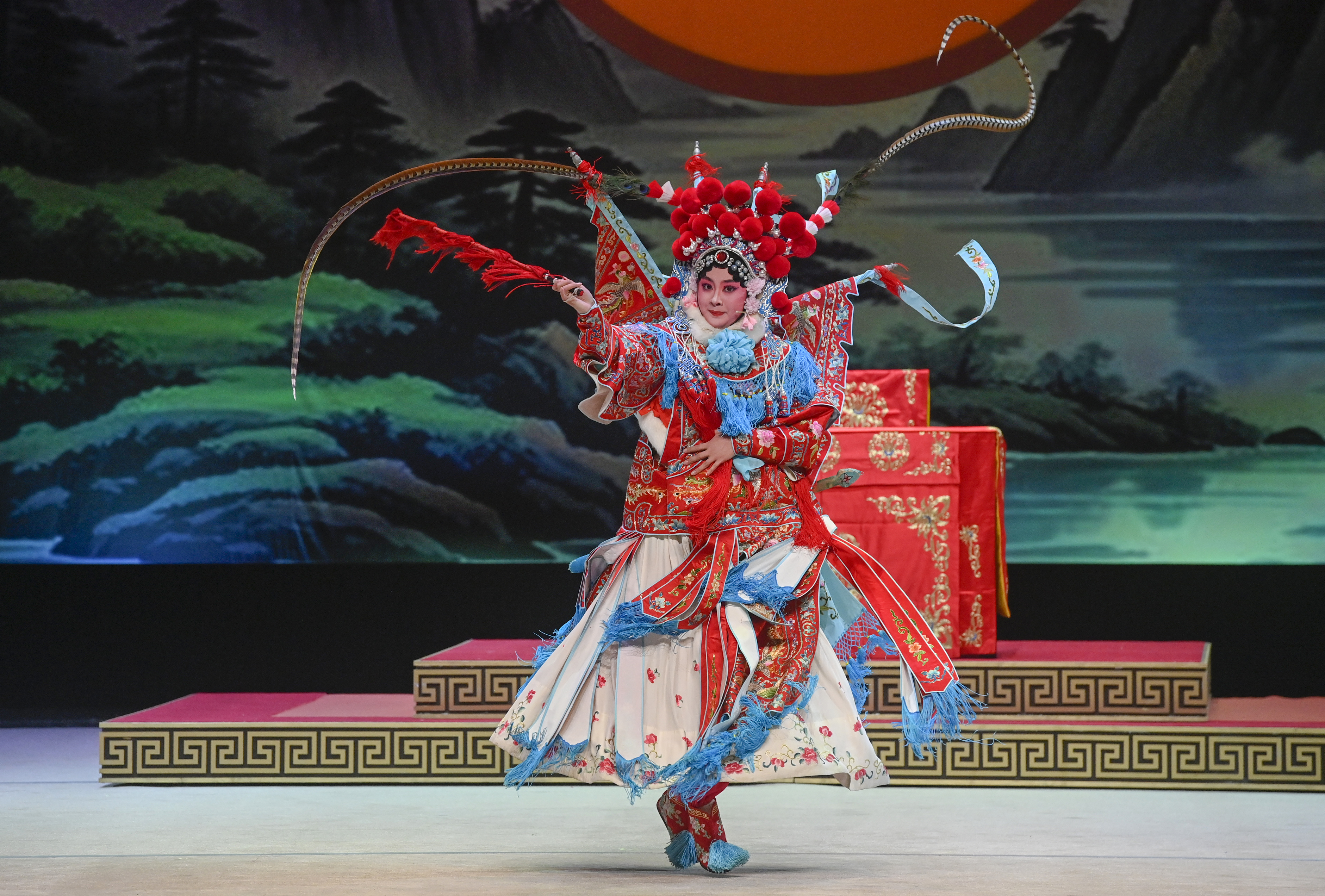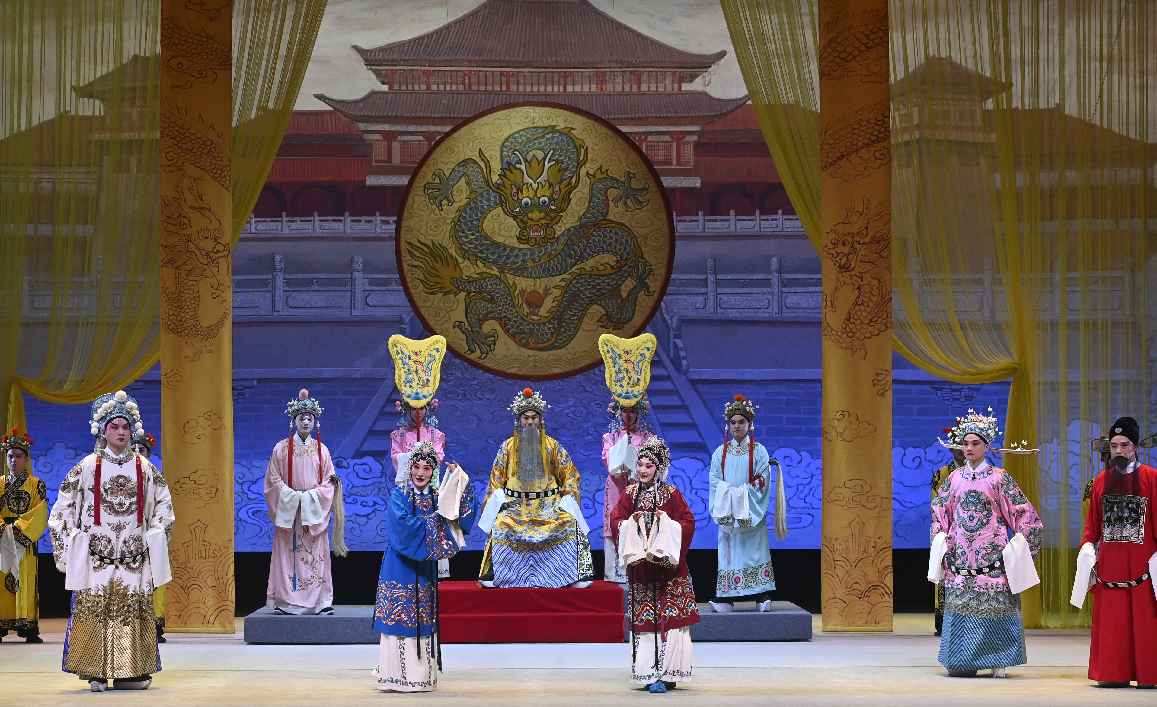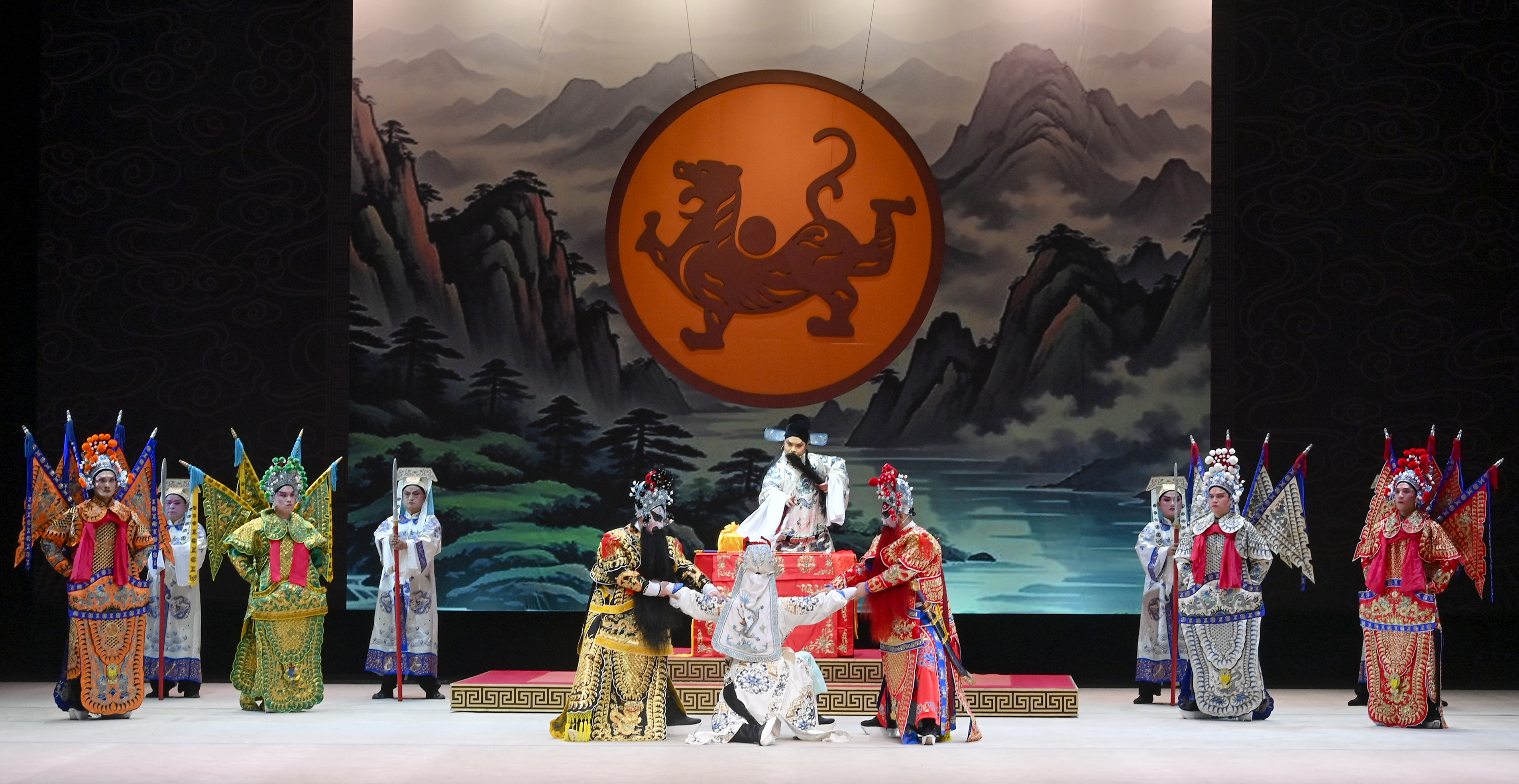 随着演出渐入佳境,现代红色题材淮剧《宋公堤·宋公夜访》让观众沉浸在军民同心筑堤的峥嵘岁月中,那份鱼水深情感人至深。最后登场的《白虎堂·辕门斩子》则由盐城市淮剧团青年演员担纲演出。青年演员们以扎实的功底将“忠孝难两全”的悲壮与担当演绎得铿锵有力,翻打跌扑间尽显朝气,赢得满堂喝彩。