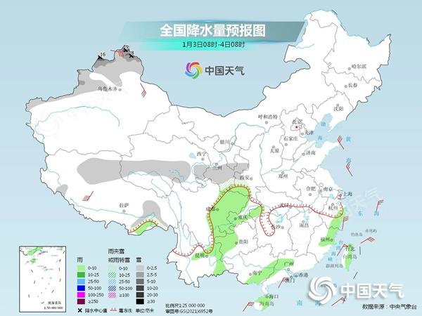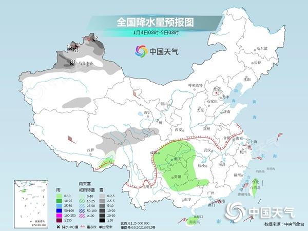 今起三天,我国降水区域仍将集中在西南地区,新疆等部分地区降雪也比较频繁。其中今天,新疆北部、西藏东南部、青海中部、甘肃南部、陕西西南部等地部分地区有小到中雪或雨夹雪,其中,新疆北疆北部等高海拔地区有大到暴雪(10~16毫米)。四川盆地、重庆西部、贵州中西部、云南东部、海南岛、台湾岛等地部分地区有小雨。