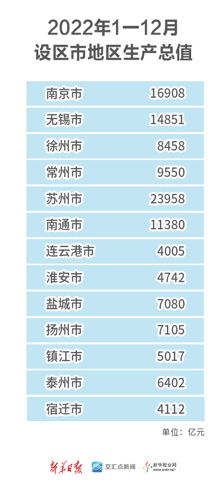 此后,江苏13市的GDP数据也随之陆续揭晓,各地区GDP总量分别为:南京市16908亿元、无锡市14851亿元、徐州市8458亿元、常州市9550亿元、苏州市23958亿元、南通市11380亿元、连云港市4005亿元、淮安市4742亿元、盐城市7080亿元、扬州市7105亿元、镇江市5017亿元、泰州市6402亿元、宿迁市4112亿元。