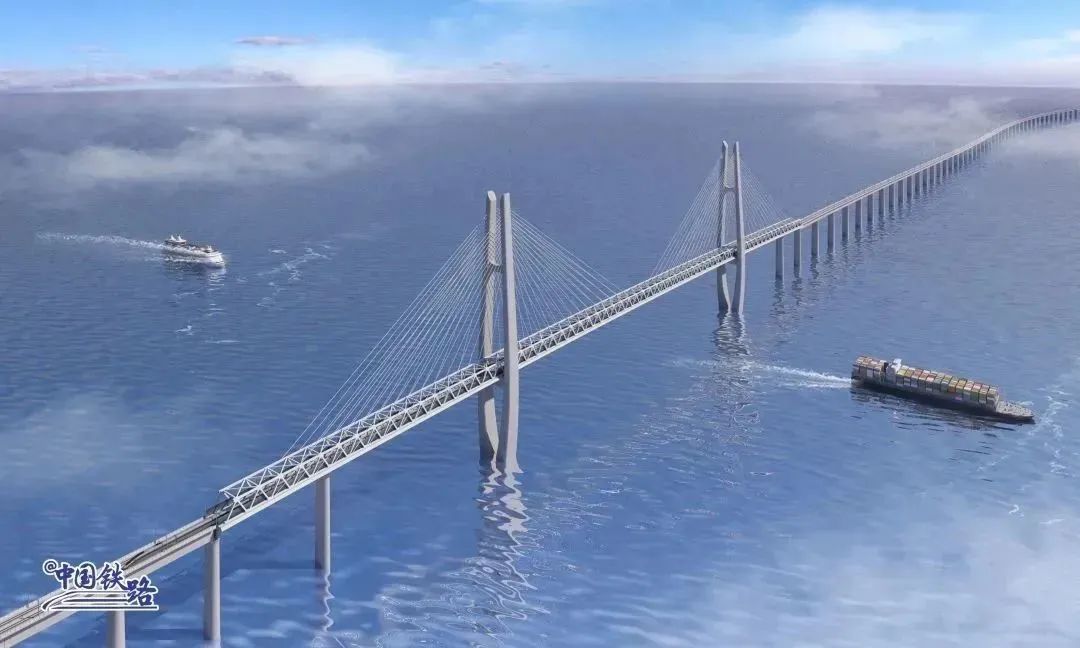 通苏嘉甬铁路杭州湾跨海铁路桥由沪杭客专公司建设管理、中国铁设和中铁大桥院设计、中咨管理监理、中铁大桥局等单位承建,是南通至宁波高铁控制性工程,设计时速350公里,全长29.2公里,共有北、中、南三座航道桥和跨大堤、海中、浅滩区引桥,属超长大的高速铁路桥梁集群工程,其中北航道桥主跨为450米,是世界最大跨度无砟轨道斜拉桥;中航道桥主跨为2×448米,为世界最大跨度无砟轨道三塔斜拉桥。