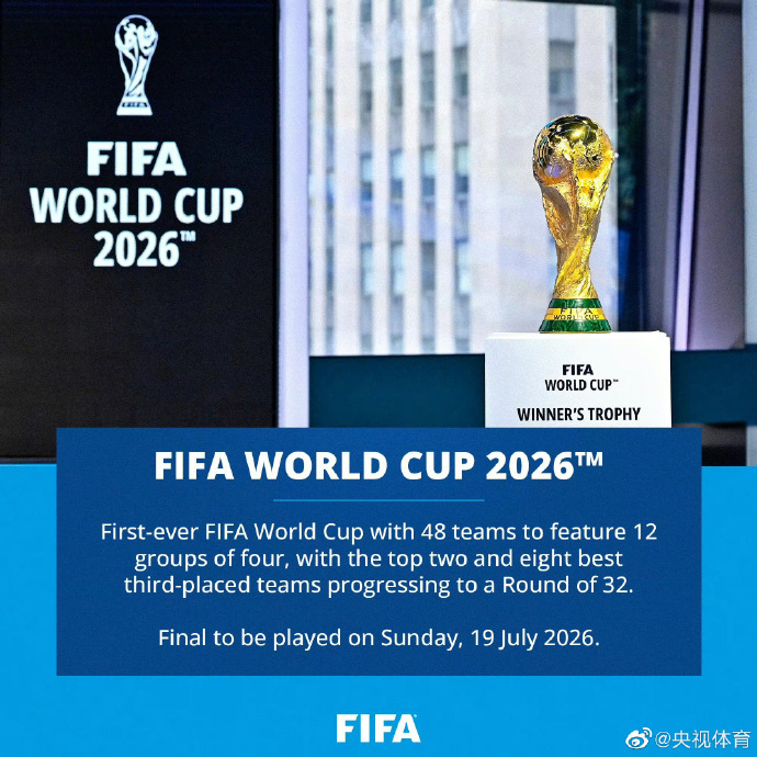 FIFA官方今日公布2026世界杯赛制方案:48支球队分成12个小组,小组前两名和8个成绩最好的小组第三晋级32强,淘汰赛将新增一轮1/16决赛。整届赛事共计104场比赛,为期40天。夺冠球队需进行八场比赛,而非之前的七场。2026世界杯将由美国、加拿大、墨西哥三国联合主办。