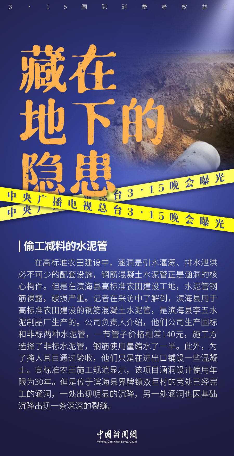 晚会曝光江苏省盐城市滨海县高标准农田的地下漏洞,用于建设的钢筋混凝土水泥管存在偷工减料问题。施工方选择了非标水泥管,钢筋使用量缩水了一半。中新财经记者从盐城市场监管局获悉,工作人员已经行动,后续信息会及时对外公布。