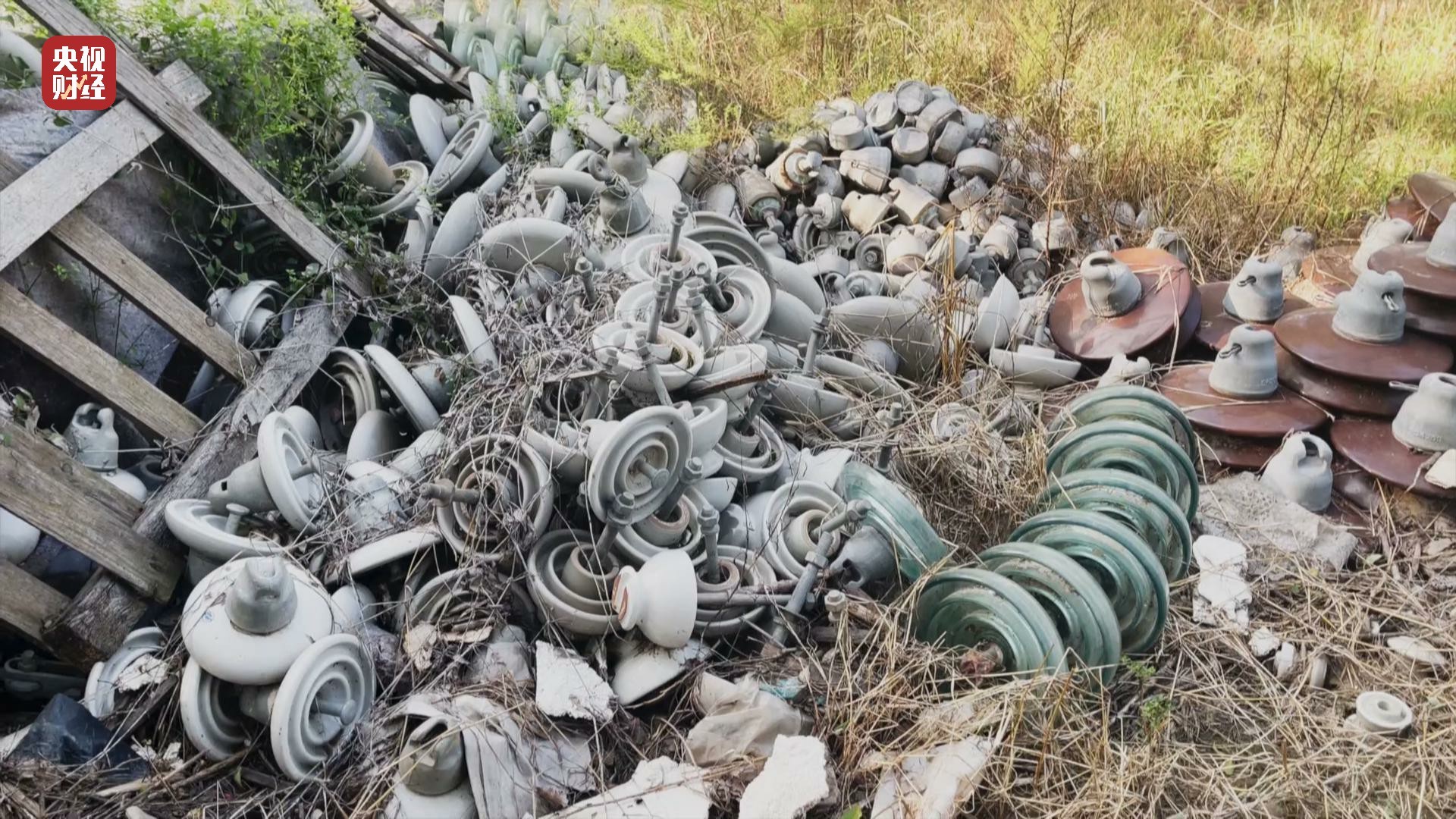 在河北省河间市西旧馆村,树林里道路两旁堆放一堆堆绝缘子,有玻璃的也有陶瓷的,金属表面有明显被腐蚀的痕迹,有的甚至锈迹斑斑。村民告诉记者,这些都是各地电网用过的旧绝缘子。