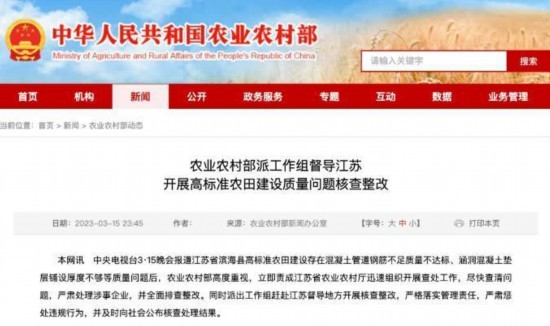 “3·15”晚会报道江苏省滨海县高标准农田建设存在混凝土管道钢筋不足质量不达标、涵洞混凝土垫层铺设厚度不够等质量问题。