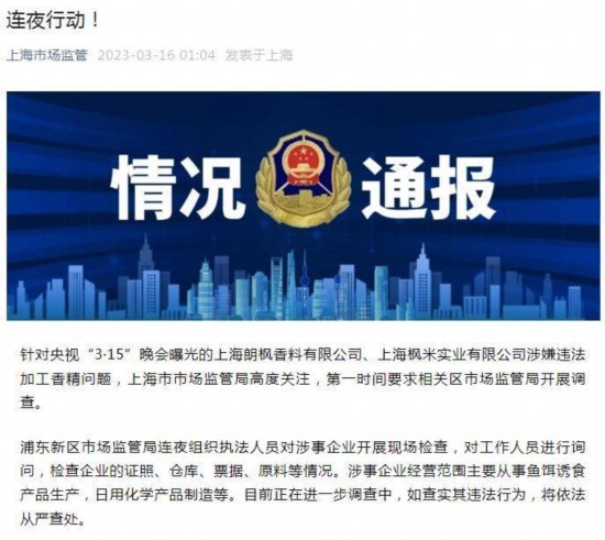 晚会曝光了上海朗枫香料有限公司、上海枫米实业有限公司涉嫌违法加工香精问题。“上海市场监管”16日通报显示,上海市市场监管局第一时间要求相关区市场监管局开展调查。