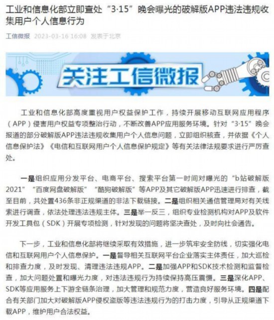 针对“3·15”晚会报道的部分破解版APP违法违规收集用户个人信息问题,工信部16日发文表示,立即组织核查,并依据《个人信息保护法》《电信和互联网用户个人信息保护规定》等有关法律法规要求进行严厉查处。