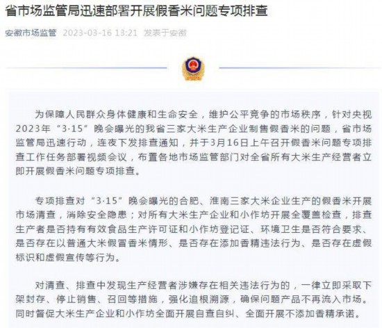 “安徽市场监管”16日发布通告称,省市场监管局于3月16日上午召开假香米问题专项排查工作任务部署视频会议,布置各地市场监管部门对全省所有大米生产经营者立即开展假香米问题专项排查。