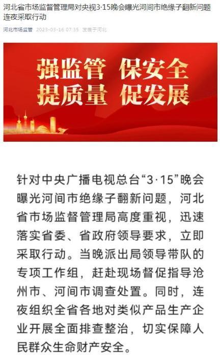 晚会曝光废旧绝缘子刷刷即上市,大量翻新绝缘子流向多地电力工程。位于河北省沧州市河间市的沧州明发电力电器有限公司和河北庆荣电力器材有限公司被点名。“河北市场监管”16日发布通报表示,河北省市场监督管理局当晚派出专项工作组,赶赴现场督促指导沧州市、河间市调查处置。同时,连夜组织全省各地对类似产品生产企业开展全面排查整治,切实保障人民群众生命财产安全。