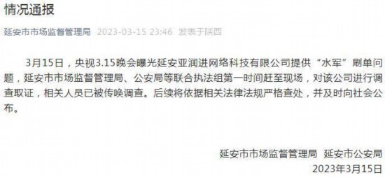 晚会曝光了一些平台售卖直播水军等行为。陕西亚润进网络科技有限公司是被曝光的公司之一。3月15日晚,陕西延安市场监督管理局发布情况通报,市监局工作人员已经前往亚润进网络科技有限公司地址处进行调查取证,相关人员已被传唤调查。后续将依据相关法律法规严格查处,并及时向社会公布。