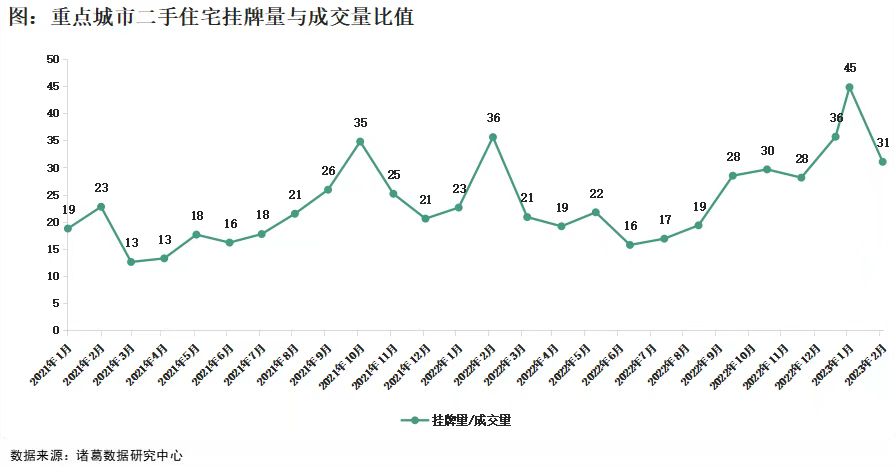 与此同时,二手房成交量大增与挂牌量居高不下现象交织并存。作为近期以来楼市回温的主体,二手房市场可谓是抢占各大热门,多城二手房带看、成交数据亮眼。一方面是二手房成交量增加,市场行情火热,另一方面则是二手房挂牌量并没有因交易量的提升而减少,反而居高不下。根据诸葛数据研究中心监测数据显示,2023年1月份重点10城二手房挂牌量与成交量的比值升至45,达到近两年峰值,2月份随着成交端走强,挂牌量与成交量比值降至31,但是仍处于历史高位水平。