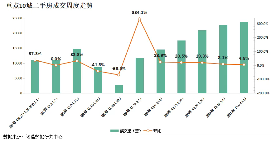 二手房方面,2023年第10周(2月27日-3月5日)重点10城成交22719套,环比上升8.1%,涨幅较上周收窄11.2个百分点;第11周(3月6日-3月12日)重点10城二手房成交23810套,环比上涨4.8%,涨幅较上周收窄3.3个百分点。二手房市场复苏势头强于新房,3月份仍然维持涨势,但是从周度增幅来看也在走弱,上涨动力逐渐显露不足。