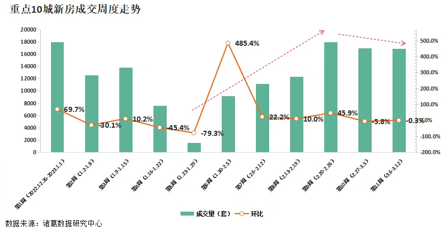 根据诸葛数据研究中心监测数据显示,2023年第10周(2月27日-3月5日)重点10城新房成交16941套,环比下降5.77%;第11周(3月6日-3月12日)重点10城新房成交16895套,环比下降0.27%。新房成交在进入3月份后上升态势戛然而止,近两周连续下滑。