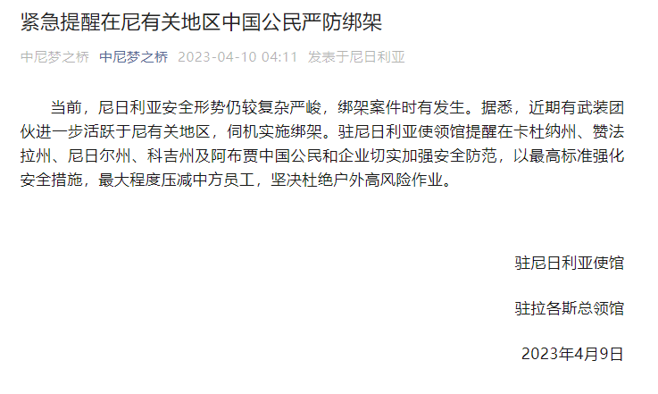 据中国驻尼日利亚大使馆微信公众号消息,驻尼日利亚使馆和驻拉各斯总领馆10日发布紧急提醒,提醒在尼有关地区中国公民严防绑架。当前,尼日利亚安全形势仍较复杂严峻,绑架案件时有发生。据悉,近期有武装团伙进一步活跃于尼有关地区,伺机实施绑架。驻尼日利亚使领馆提醒在卡杜纳州、赞法拉州、尼日尔州、科吉州及阿布贾中国公民和企业切实加强安全防范,以最高标准强化安全措施,最大程度压减中方员工,坚决杜绝户外高风险作业。