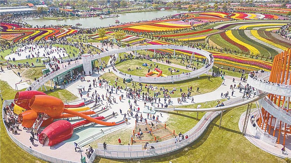 一到周末,荷兰花海停车场里就挤满了来自全国各地的大小旅游车辆,各地旅行社的小旗子随风飘展,成为一道靓丽的风景。