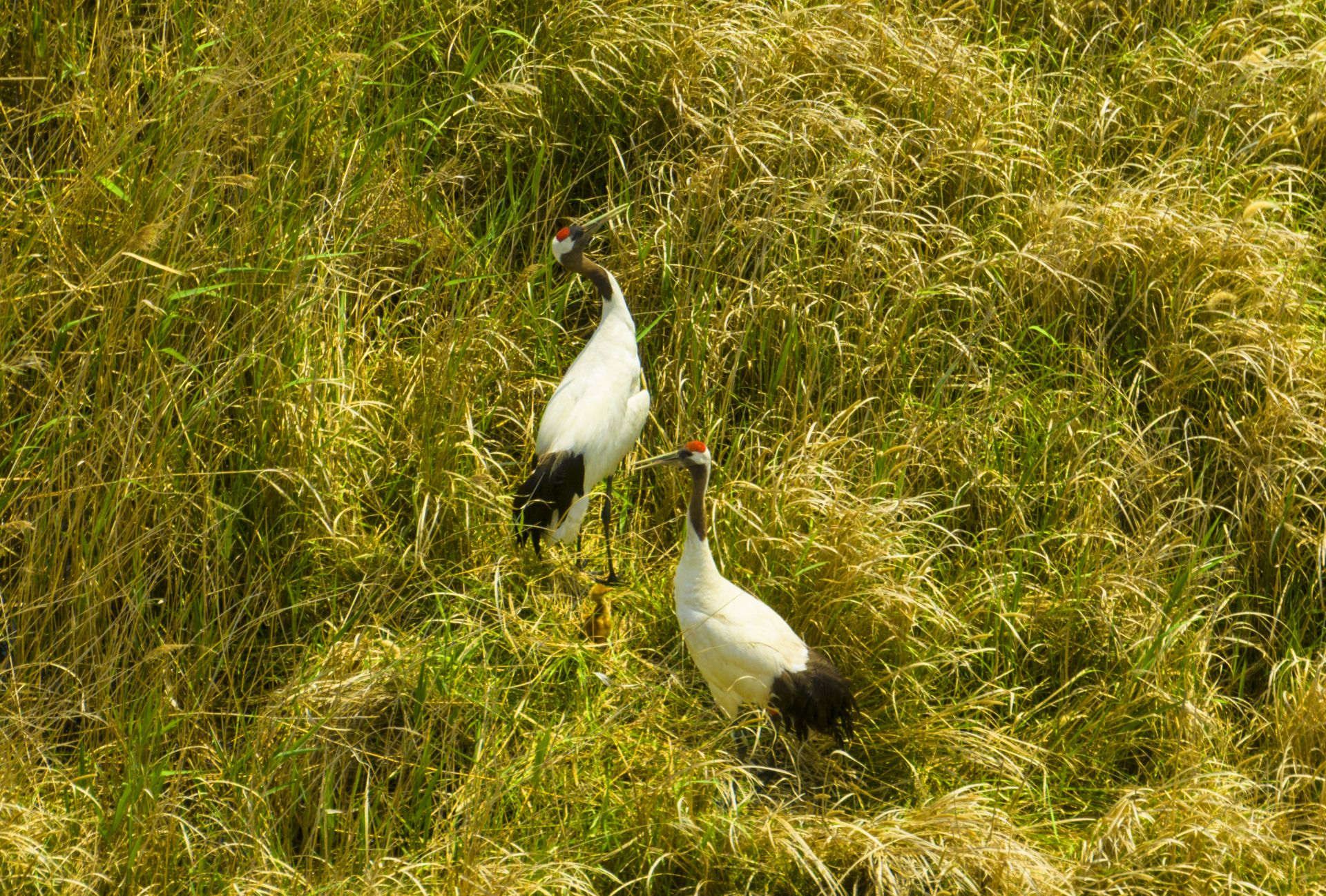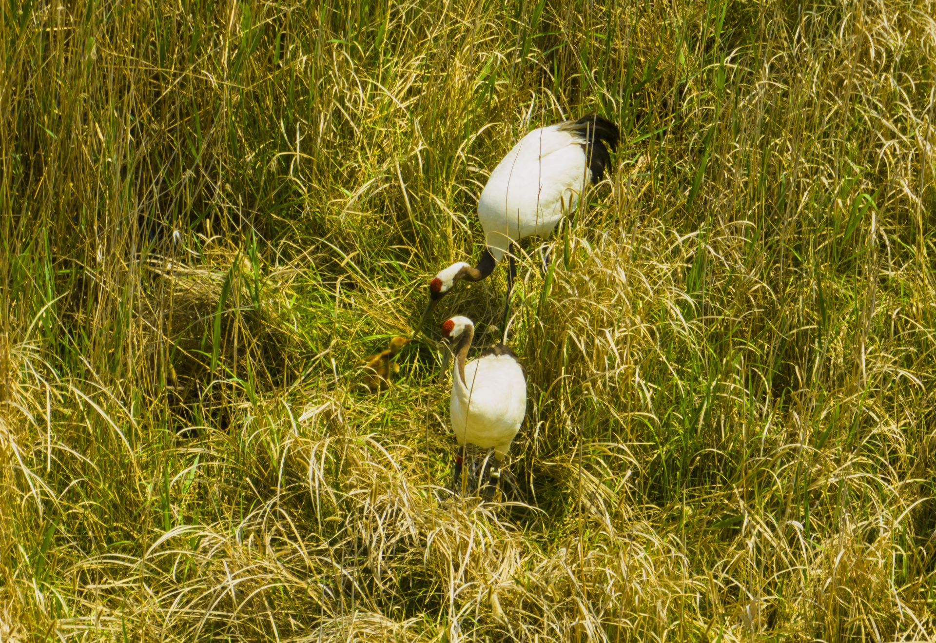 两只成年丹顶鹤领着一只刚出生4天的小鹤在芦苇荡里悠闲漫步,它们或低头觅食、或翩翩起舞,为广袤的湿地增添了别样的韵味……4月23日上午9点,江苏盐城湿地珍禽国家级自然保护区管理处资源管理与保护科副科长陈国远在保护区滩涂深处巡查时,运用无人机拍下这美好的画面。今年该保护区共发现5对丹顶鹤野外成功产卵9枚,是我国有记录以来,丹顶鹤在越冬地野外自然繁殖产卵数量最多的一次。