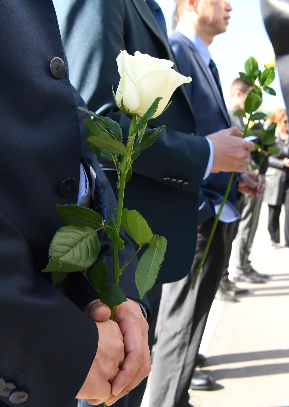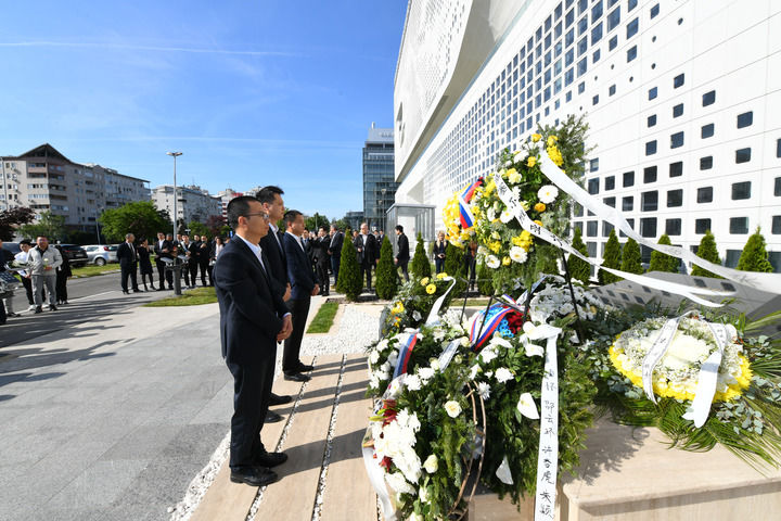 5月7日,在塞尔维亚贝尔格莱德,中资企业代表在中国驻南斯拉夫联盟大使馆旧址前的烈士纪念碑前肃立。新华社记者 任鹏飞 摄