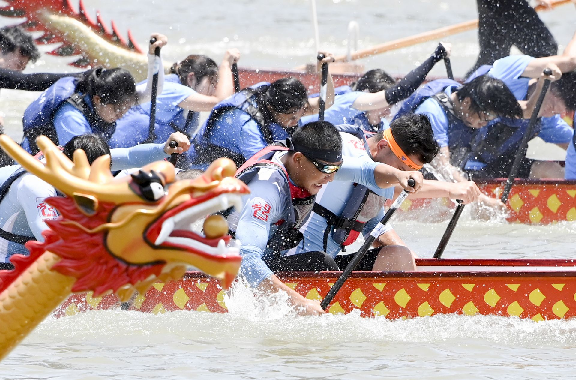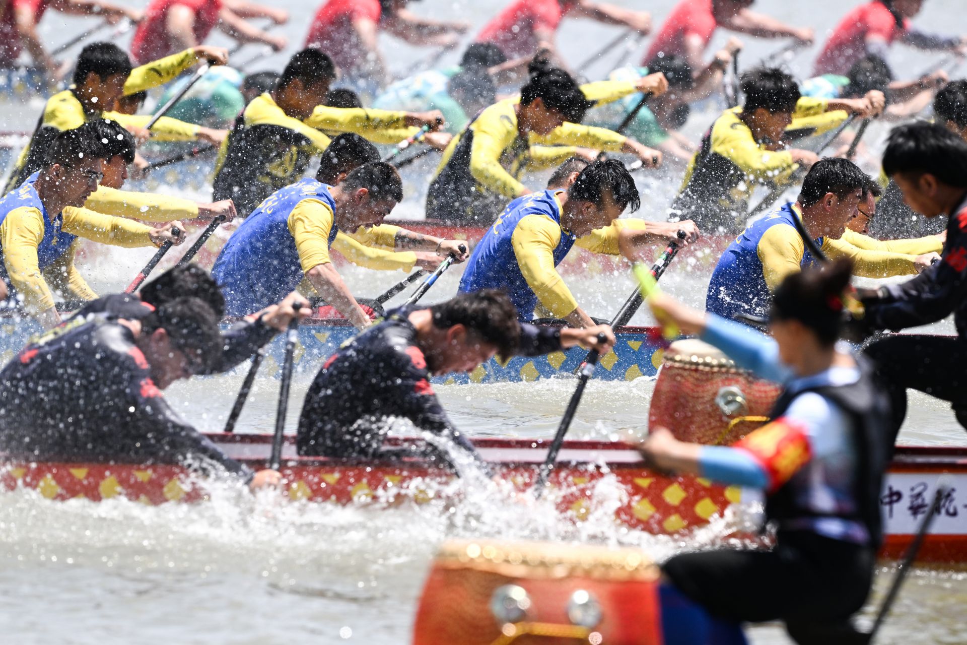 当天上午10点半,开幕式完成龙舟“点睛”环节后,裁判员一声令下,鼓手抡起鼓槌、擂起助威鼓,运动员们和着鼓点、喊着号子、挥动着船桨,奋楫争先。观赛群众簇拥在新洋港河岸边,为运动员加油鼓劲,现场十分热闹。