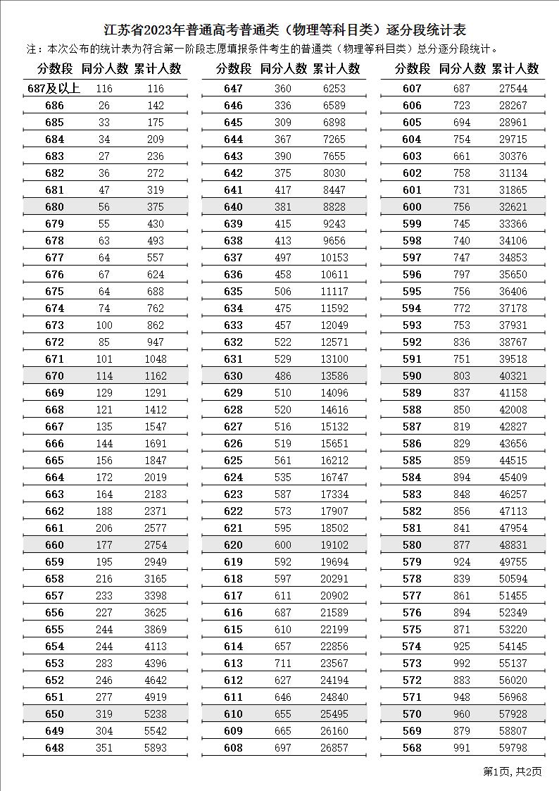 江苏省教育考试院24日公布江苏省2023年普通高考逐分段统计表。