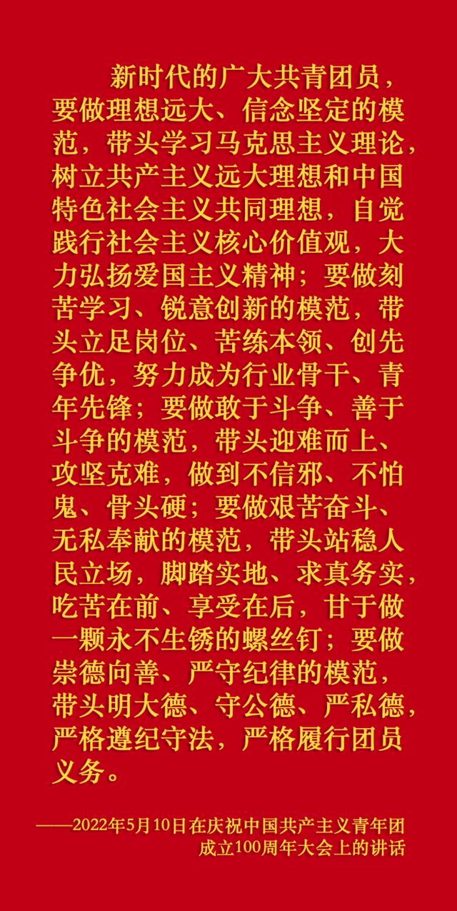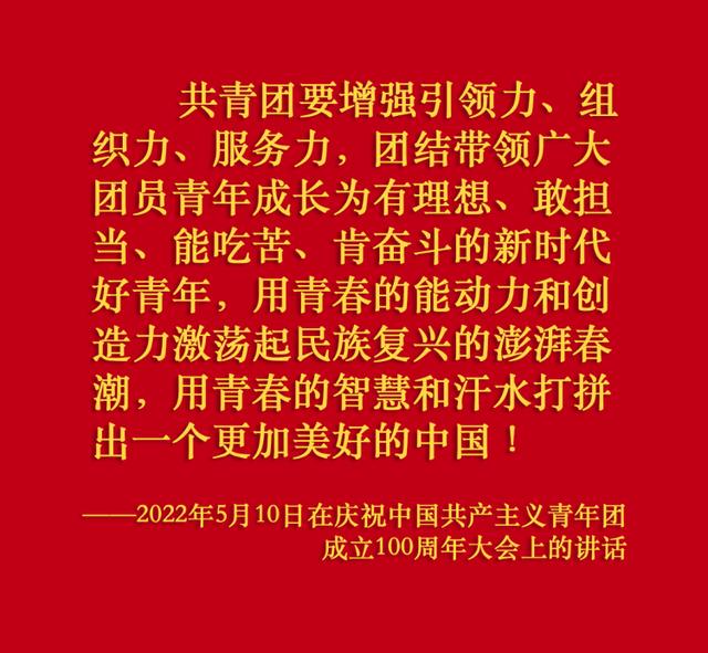 在庆祝中国共产主义青年团成立100周年大会上,习近平总书记从党和国家事业发展全局出发,给共青团明确提出了4点希望,饱含深情、催人奋进。