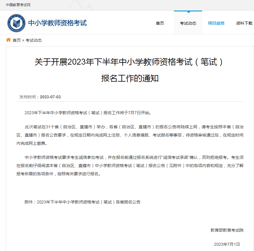 2023年下半年中小学教师资格考试(笔试)报名工作将于7月7日开始。