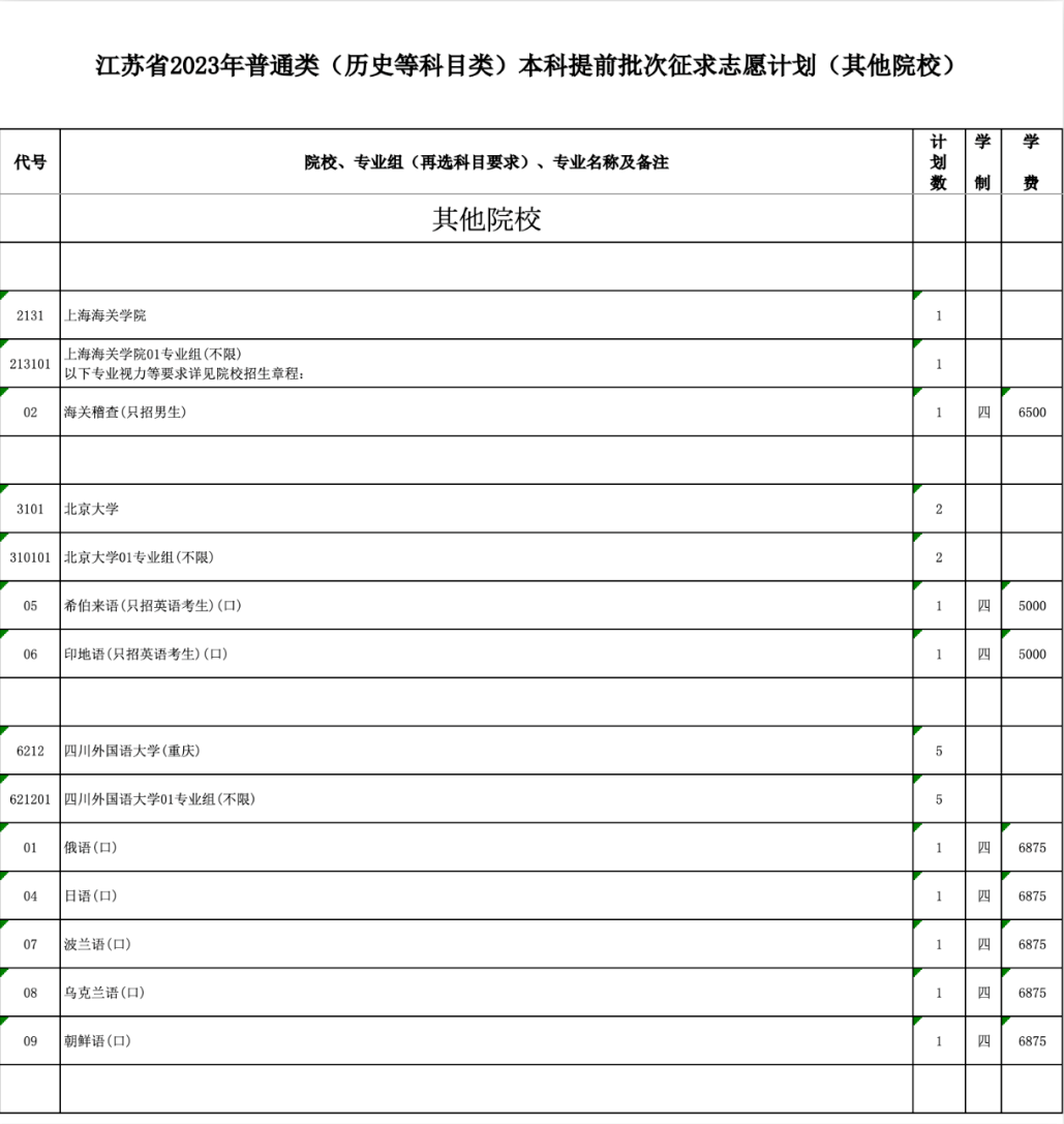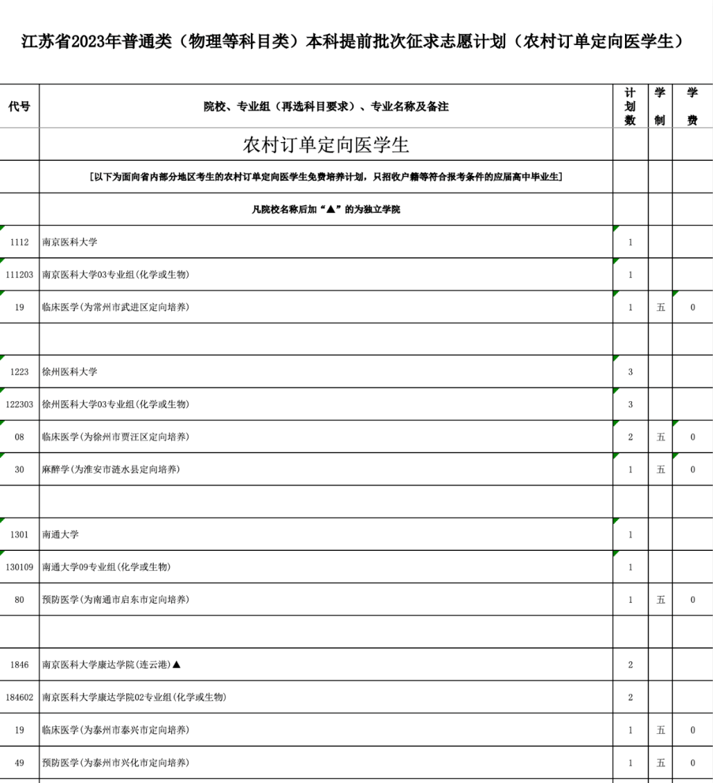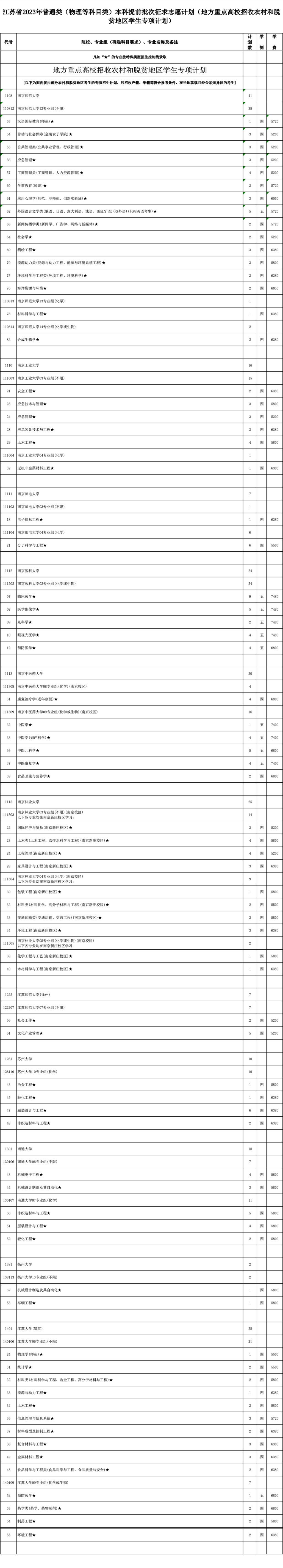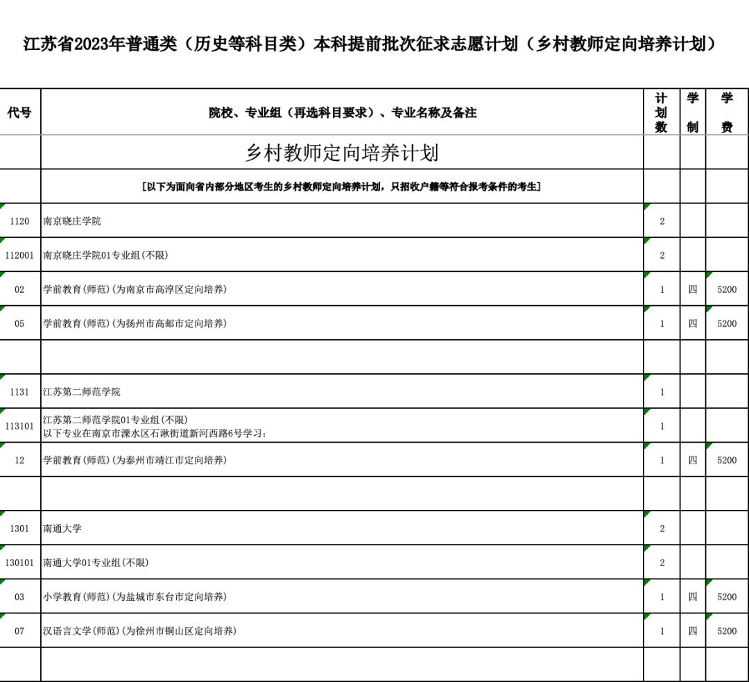 本次征求志愿包括军事、公安政法、航海、地方重点高校招收农村和脱贫地区学生专项计划(以下简称“地方专项计划”)、乡村教师定向培养计划(以下简称“乡村教师计划”)、农村订单定向医学生免费培养计划(以下简称“医学定向计划”)以及其他院校共7类计划,具体详见《江苏省2023年普通高校招生普通类本科提前批次征求志愿计划》(考生可登录江苏省教育考试院门户网站www.jseea.cn浏览或下载)。