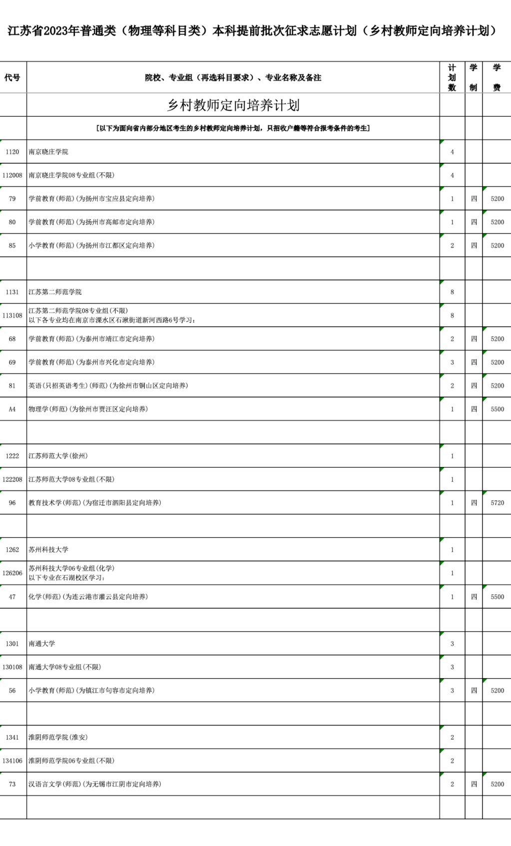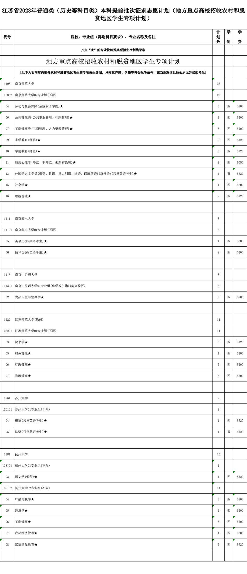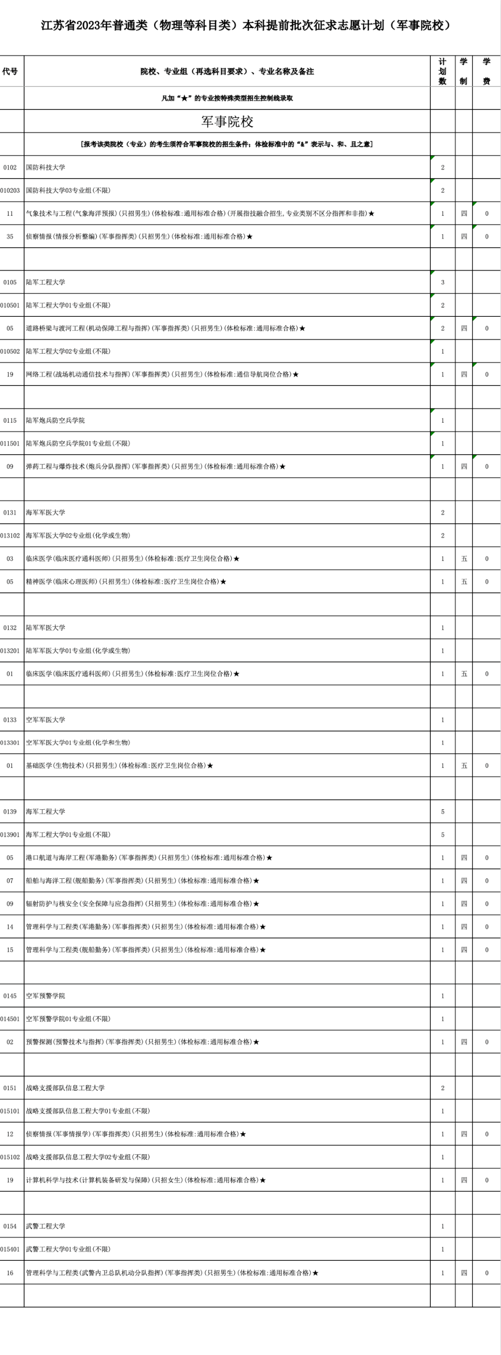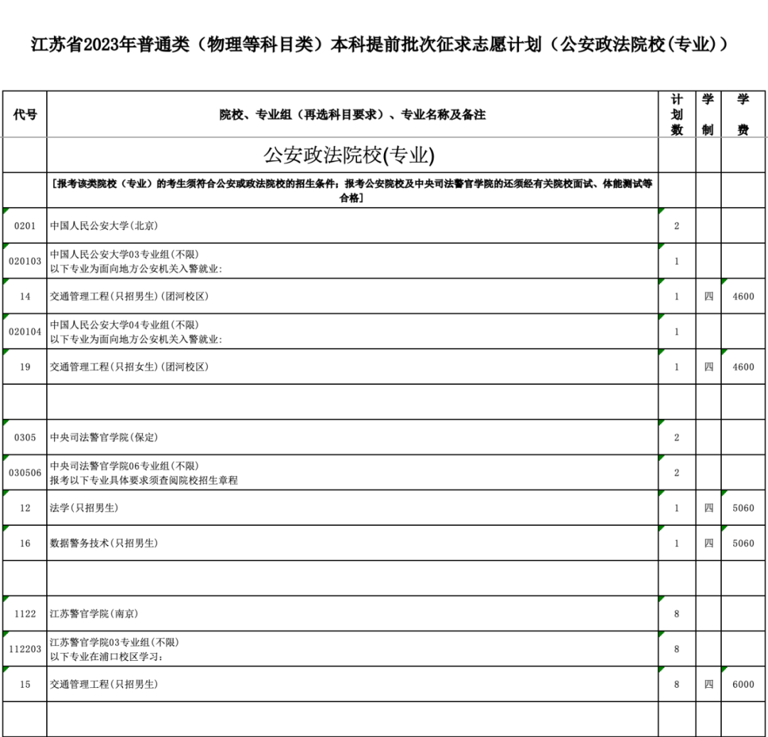 本次征求志愿包括军事、公安政法、航海、地方重点高校招收农村和脱贫地区学生专项计划(以下简称“地方专项计划”)、乡村教师定向培养计划(以下简称“乡村教师计划”)、农村订单定向医学生免费培养计划(以下简称“医学定向计划”)以及其他院校共7类计划,具体详见《江苏省2023年普通高校招生普通类本科提前批次征求志愿计划》(考生可登录江苏省教育考试院门户网站www.jseea.cn浏览或下载)。