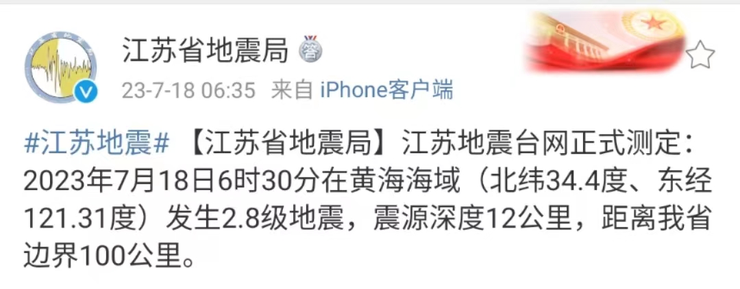 交汇点讯 江苏地震台网正式测定:2023年7月18日6时30分在黄海海域(北纬34.4度、东经121.31度)发生2.8级地震,震源深度12公里,距离我省边界100公里。