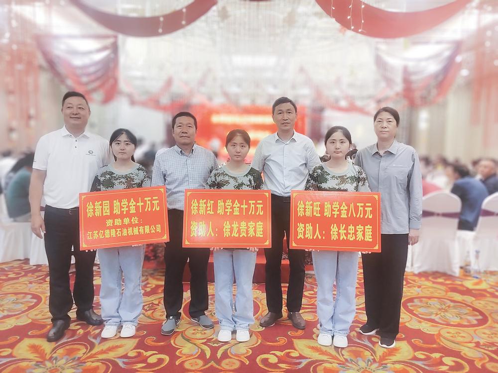 盐城市徐铎文化研究会会长徐文荣、建湖县徐氏文化联谊会会长徐中辉为三姐妹颁授助学金36200元,定向用于三姐妹在大学期间的学习用品添置及奖学金;建湖县三位徐氏企业家徐中辉、徐龙贵、徐长忠分别为三胞胎姐妹颁授助学金。其中,徐中辉董事长结对资助徐新园大学五年生活费100000元、徐龙贵董事长结对资助徐新红大学五年生活费100000元,徐长忠董事长结对资助徐新旺大学四年生活费80000元。生活费按每人每学期10000元计算,在每学期开学前15天由三位企业家分别以“一对一、点对点”存入三姐妹个人账户,定向用于三姐妹大学期间生活费用支出。