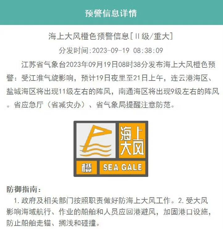 9月19日8时38分,江苏省气象台发布海上大风橙色预警:受江淮气旋影响,预计19日夜里至21日上午,连云港海区、盐城海区将出现11级左右的阵风,南通海区将出现9级左右的阵风。省应急厅(省减灾办)、省气象局提醒注意防范。