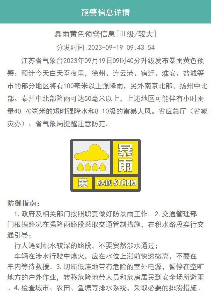 江苏省气象台2023年09月19日9时40分升级发布暴雨黄色预警:预计今天白天至夜里,徐州、连云港、宿迁、淮安、盐城等市的部分地区将有100毫米以上强降雨,另外南京北部、扬州中北部、泰州中北部降雨可达50毫米以上,上述地区可能伴有小时雨量40-70毫米的短时强降水和8-10级的雷暴大风。省应急厅(省减灾办)、省气象局提醒注意防范。