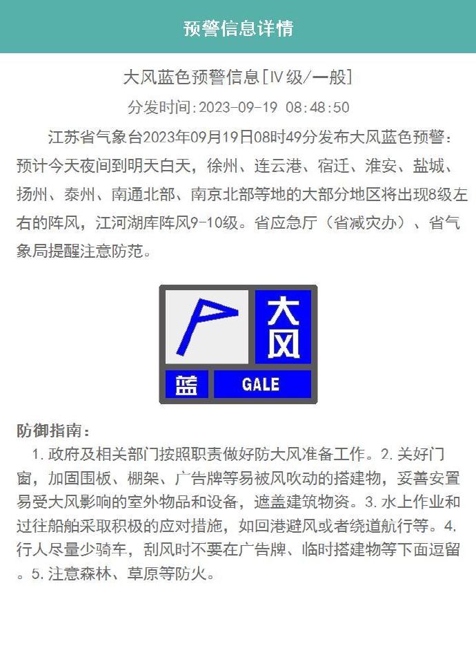 江苏省气象台2023年09月19日08时49分发布大风蓝色预警:预计今天夜间到明天白天,徐州、连云港、宿迁、淮安、盐城、扬州、泰州、南通北部、南京北部等地的大部分地区将出现8级左右的阵风,江河湖库阵风9-10级。省应急厅(省减灾办)、省气象局提醒注意防范。