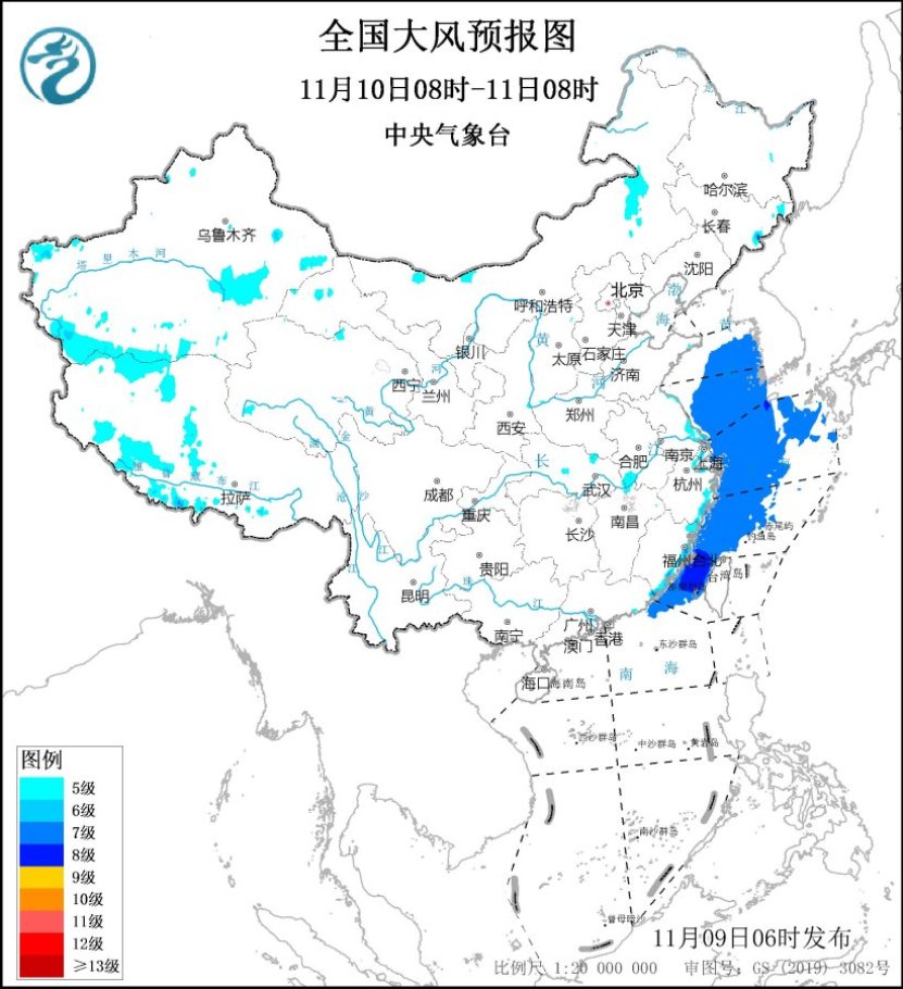 11月10日08时至11日08时,黄海中部和南部海域、东海大部海域、台湾海峡、南海东北部偏北海域将有7~8级、阵风9~10级的大风。新疆东部和南部、西藏南部和西北部、内蒙古东部、东南沿海将有5~6级、阵风7~8级的大风。中央气象台11月9日06时发布大风蓝色预警(见图1、2)。