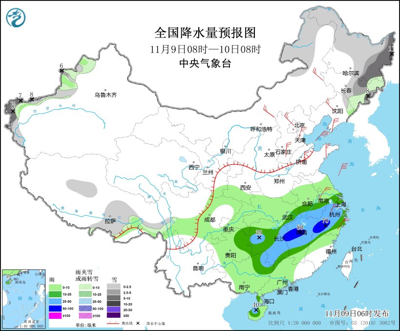 11月9日08时至10日08时,新疆西部、内蒙古东北部、黑龙江大部、吉林中东部、辽宁东北部等地部分地区有小到中雪或雨夹雪,其中,黑龙江东部、吉林东部、新疆南疆西部山区等地部分地区有大雪,局地暴雪。重庆东南部、贵州东部、湖北东部、湖南大部、苏皖南部、上海、江西中北部、浙江大部、福建西北部以及广西东北部等地部分地区有中到大雨,其中,江西西部和东北部、浙江西南部、福建西北部等地部分地区有暴雨(50~80毫米)。内蒙古中东部、辽宁大部、华北东部和北部、黄淮北部、江南东部等地部分地区有4~6级风(见图3)。