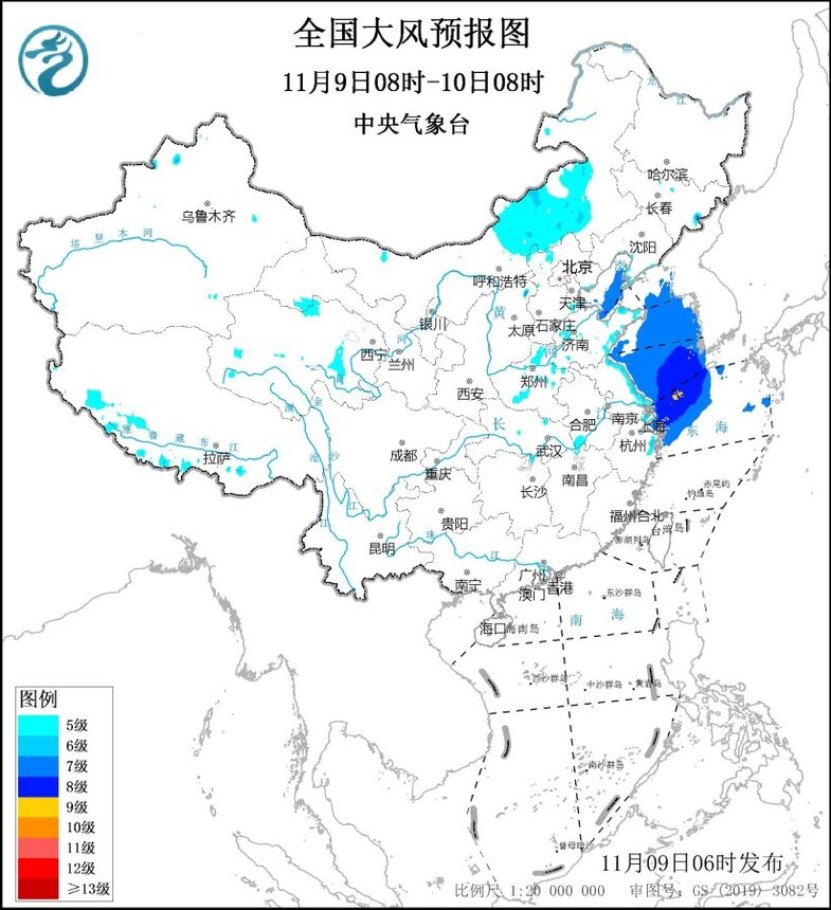 11月9日08时至10日08时,黄海大部海域、东海北部海域、渤海东部海域、渤海海峡将有7~8级、阵风9~10级的大风,其中东海北部部分海域的风力可达9级、阵风10级。内蒙古中东部、西藏南部、华东沿海将有5~6级、阵风7~8级的大风。
