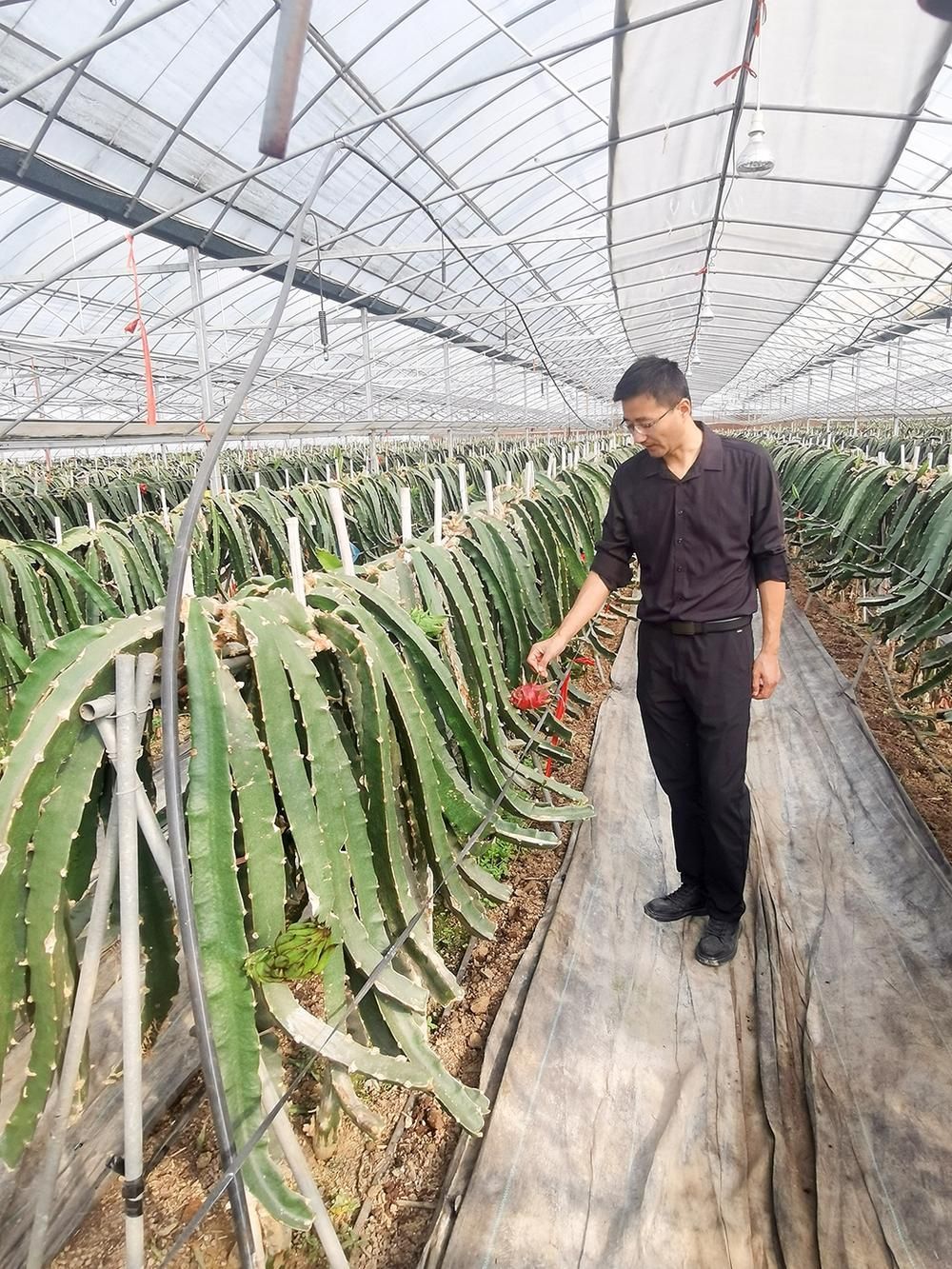 隔壁的草莓大棚里,矗立着的高架十分显眼,架子上的草莓长势正旺,通红的果实点缀在白花绿叶之间,生机勃勃、绿意盎然。“这是我们从外地学来的,利用高密度泡沫作容器,里面是用珍珠岩、泥炭等配比好的专用基质,草莓苗就栽在基质中。夏天的时候浇足水,盖上薄膜,棚内温度高达50多摄氏度,既能利用高温杀菌,又让土壤内的有机质发酵。”沈祥在一旁解释。