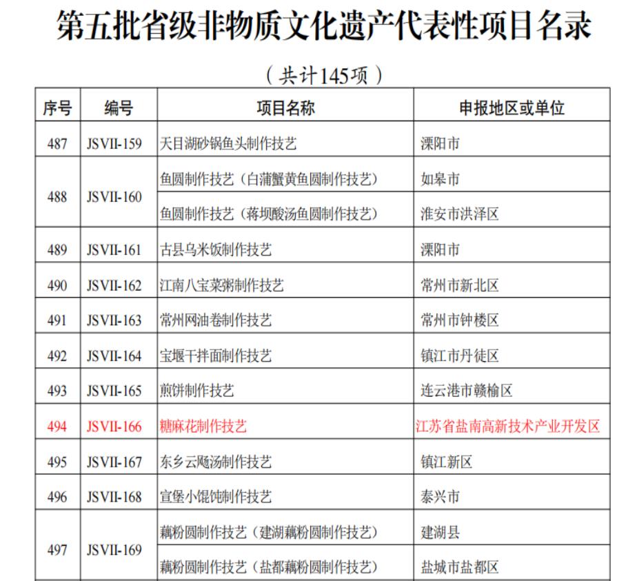 日前,江苏省人民政府正式印发《关于公布第五批省级非物质文化遗产代表性项目名录的通知》(苏政发〔2023〕100号),共有421个项目入选第五批省级非物质文化遗产代表性项目名录,由江苏省盐南高新技术产业开发区申报的“糖麻花制作技艺”位列其中。