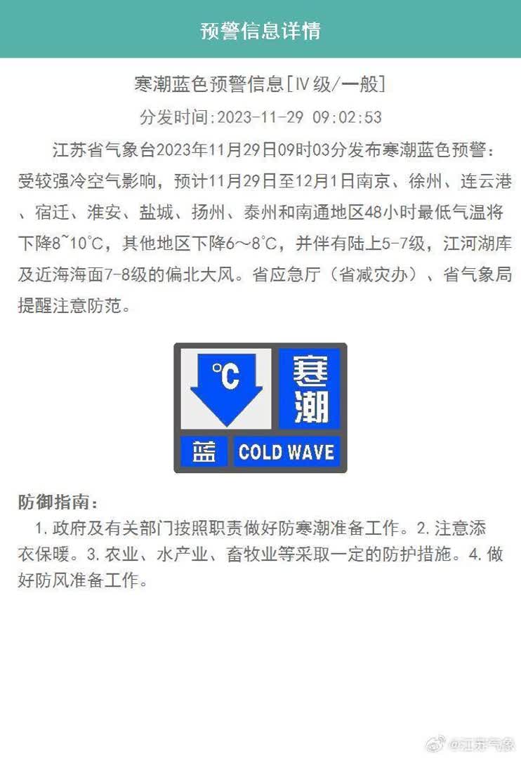 交汇点讯 11月29日09时03分,江苏省气象台发布寒潮蓝色预警:受较强冷空气影响,预计11月29日至12月1日南京、徐州、连云港、宿迁、淮安、盐城、扬州、泰州和南通地区48小时最低气温将下降8~10℃,其他地区下降6~8℃,并伴有陆上5-7级,江河湖库及近海海面7-8级的偏北大风。省应急厅(省减灾办)、省气象局提醒注意防范。