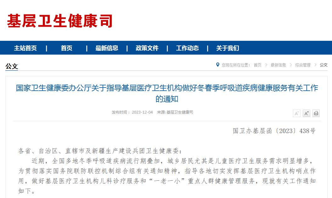 据国家卫健委消息,国家卫生健康委办公厅发布关于指导基层医疗卫生机构做好冬春季呼吸道疾病健康服务有关工作的通知。