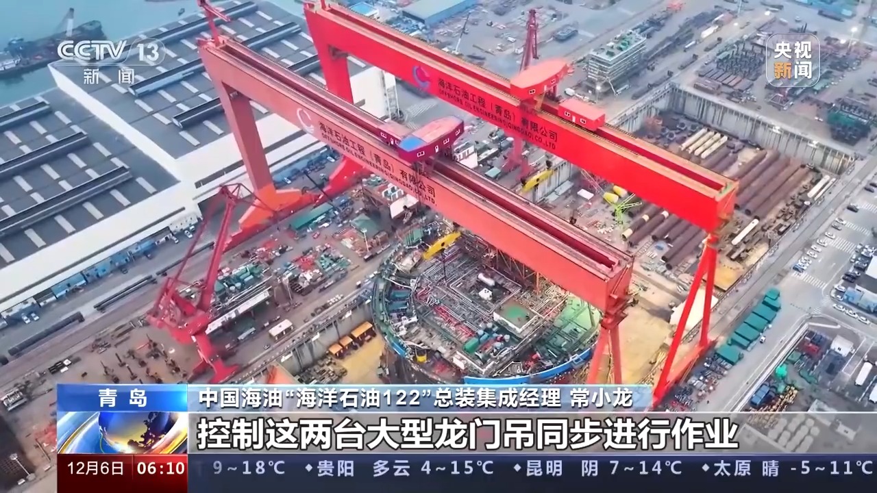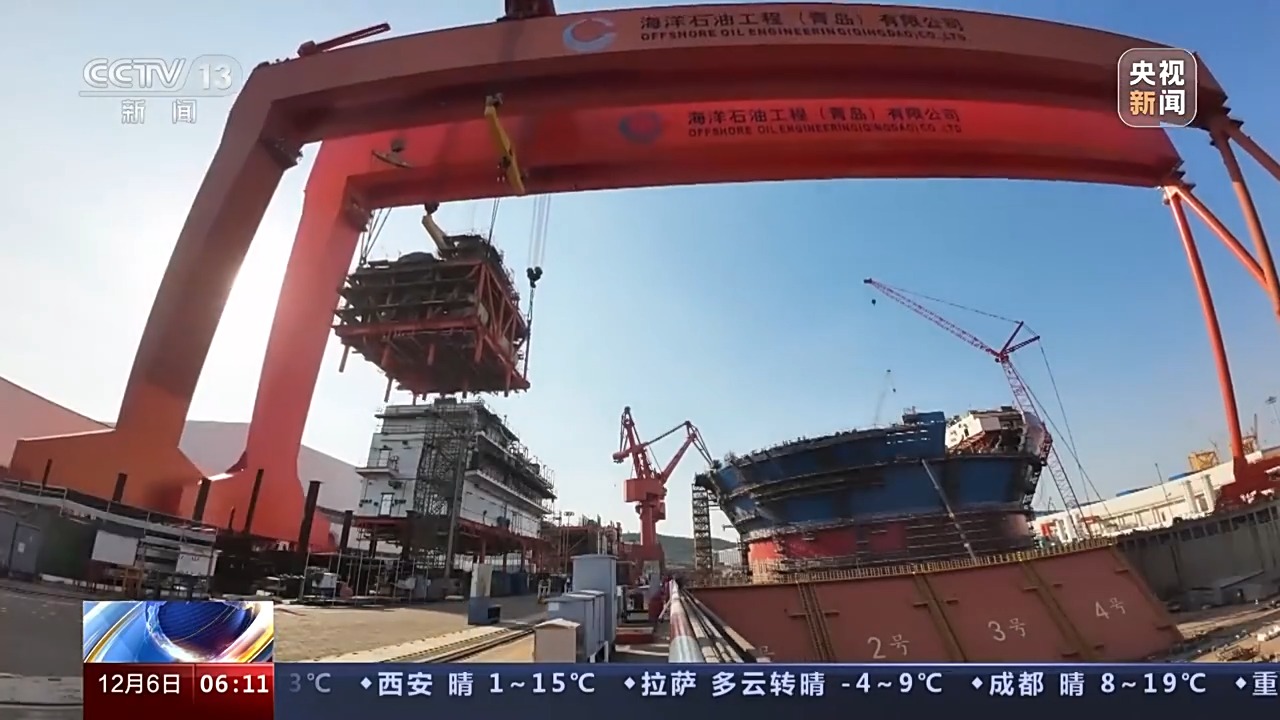 总台央视记者 张丛婧:这里是青岛海洋工程高新装备制造基地,随着现场最后一个模块吊装就位,意味着经过20个月的施工,这个集原油生产、存储、外输等功能于一体的新型“海上油气加工厂”主体结构建造完工,进入集成调试阶段。