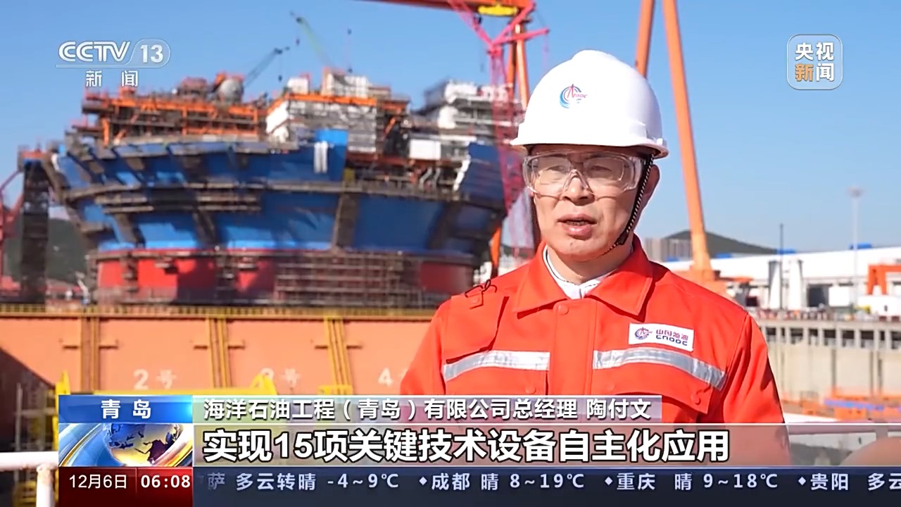 海洋石油工程(青岛)有限公司总经理 陶付文:创新采用一体化建造工艺和双龙门吊集成技术,实现15项关键技术设备自主化应用,使我国具备了根据不同油田、不同海域,自主设计制造不同类型深水油气装备的能力。