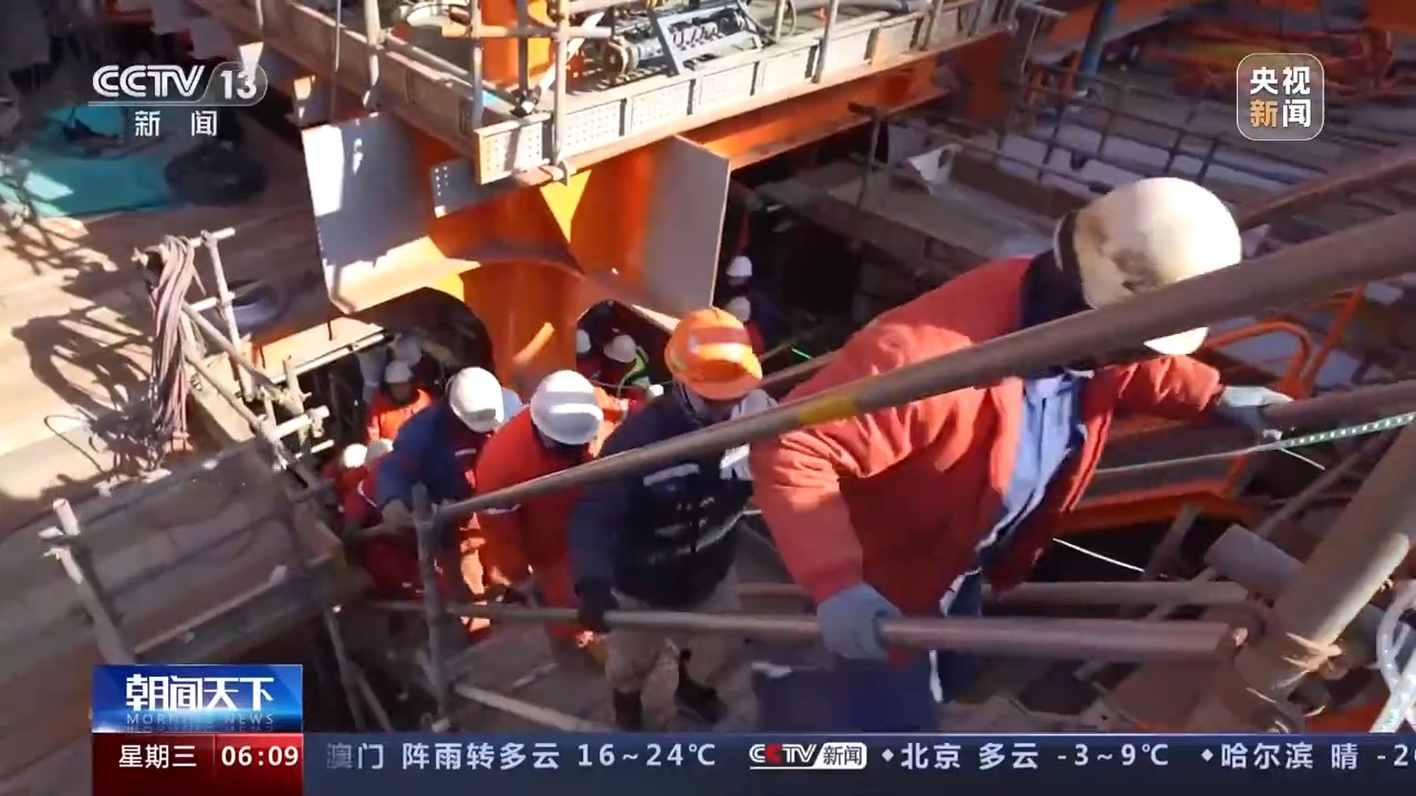 中国海油“海洋石油122”施工管理副经理 张宪彬:目前这里有近1000人施工,高峰期人数还会进一步增加,24小时轮班,进行紧张的一些机械设备的连接集成调试等工作,全力保证“超级能源碗”高质量完工,为能源强国提供深海重器。