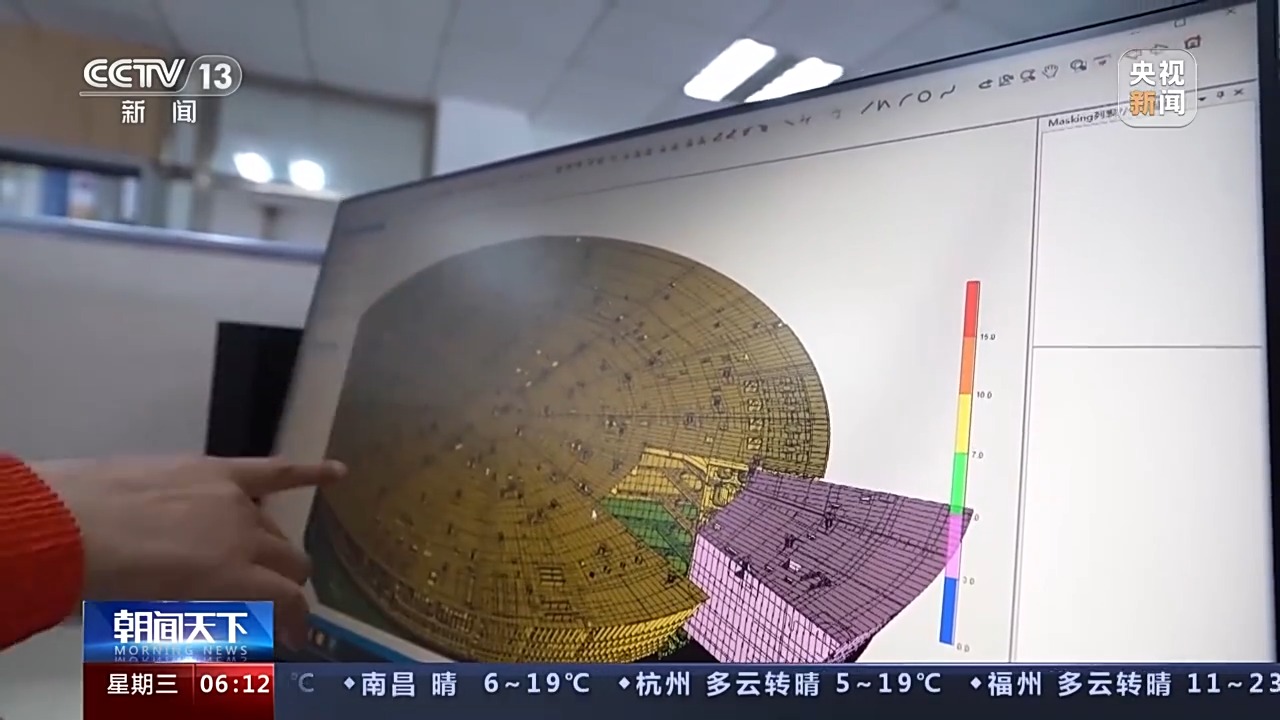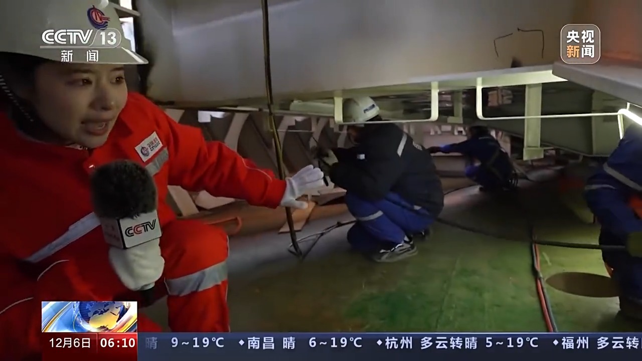 总台央视记者 张丛婧:可以看到能源碗里的空间非常狭窄,因为这些模块由几十万个零部件组成,集成度很高,我们现在进一个施工现场里看一下。工人师傅们正在这里铺设电缆,他们都是要蹲着,像这样挪动才能够完成这些操作。我发现其实像这样的高难度施工,几乎涉及所有的工种。