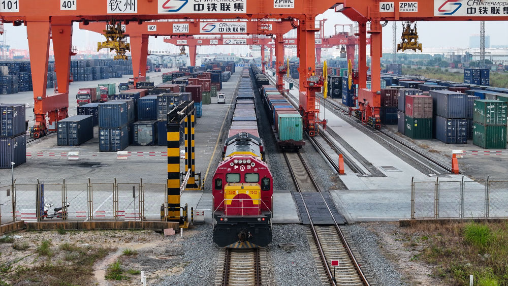 在钦州集装箱中心站,铁海联运班列整装待发(11月24日摄,无人机照片)。新华社记者 张爱林 摄