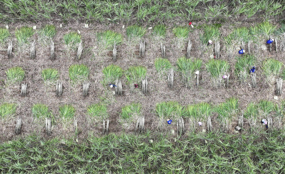 2023年12月12日,在广西来宾市兴宾区小平阳镇,农民在收割甘蔗(无人机照片)。新华社记者 周华 摄