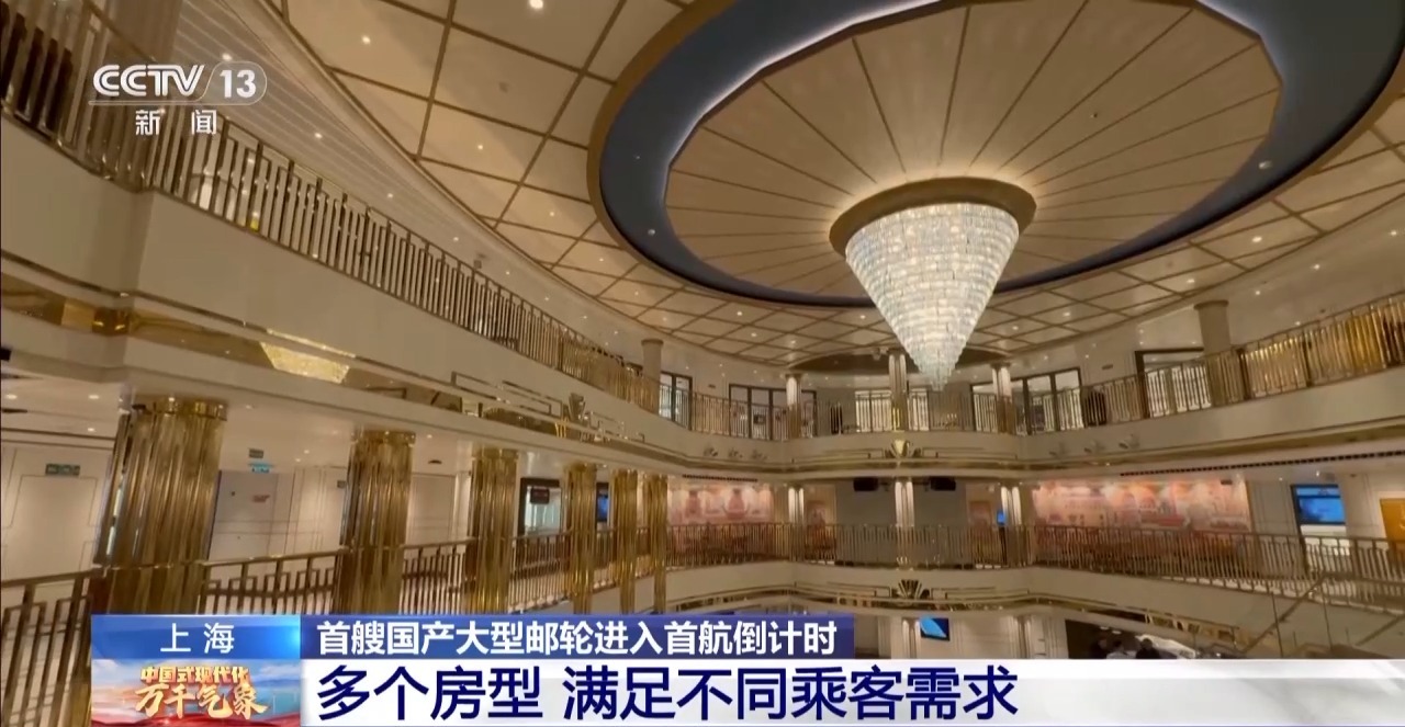 总台记者 盛瑾瑜:首艘国产大型邮轮长323.6米,宽37.2米,总吨位13.55万吨。全船20层甲板,可以容纳超过5000位乘客。在超过4万平方米的公共区域配置了餐厅、剧院、健身房等设施。这样的体量好比一座移动的海上城市。