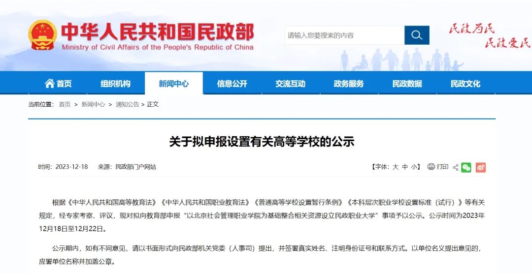 根据《中华人民共和国高等教育法》《中华人民共和国职业教育法》《普通高等学校设置暂行条例》《本科层次职业学校设置标准(试行)》等有关规定,经专家考察、评议,现对拟向教育部申报“以北京社会管理职业学院为基础整合相关资源设立民政职业大学”事项予以公示。公示时间为2023年12月18日至12月22日。