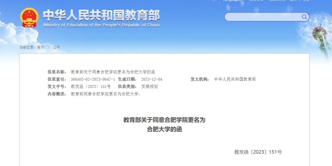 根据《中华人民共和国高等教育法》《普通高等学校设置暂行条例》《普通本科学校设置暂行规定》有关规定以及第八届全国高等学校设置评议委员会评议结果,经教育部党组会议研究决定,同意合肥学院更名为合肥大学,学校标识码为4134011059;同时撤销合肥学院的建制。