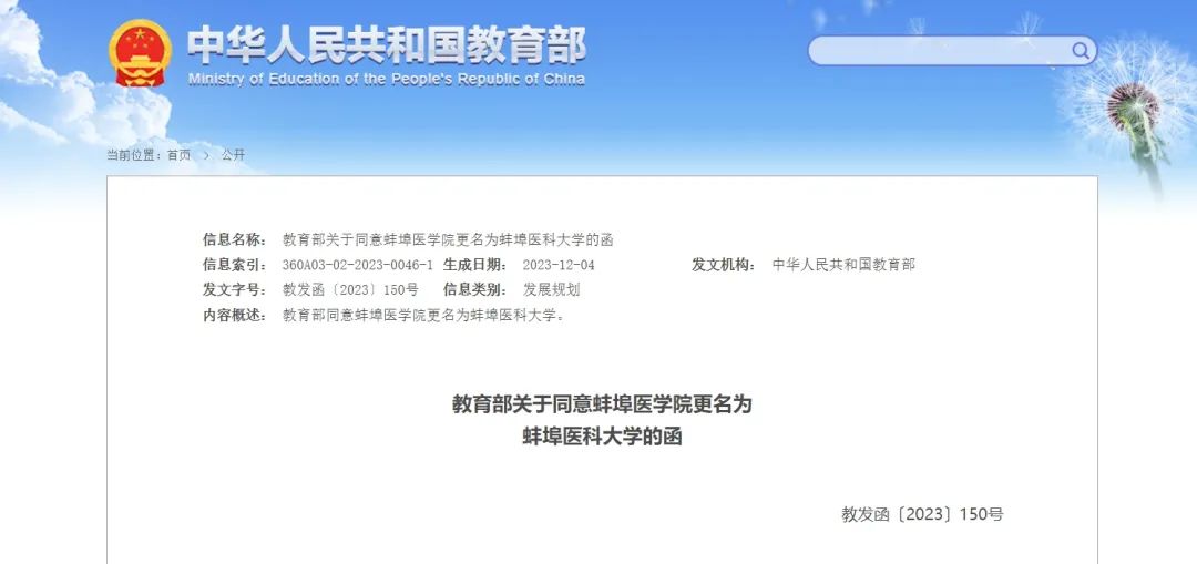 根据《中华人民共和国高等教育法》《普通高等学校设置暂行条例》《普通本科学校设置暂行规定》有关规定以及第八届全国高等学校设置评议委员会评议结果,经教育部党组会议研究决定,同意蚌埠医学院更名为蚌埠医科大学,学校标识码为4134010367;同时撤销蚌埠医学院的建制。